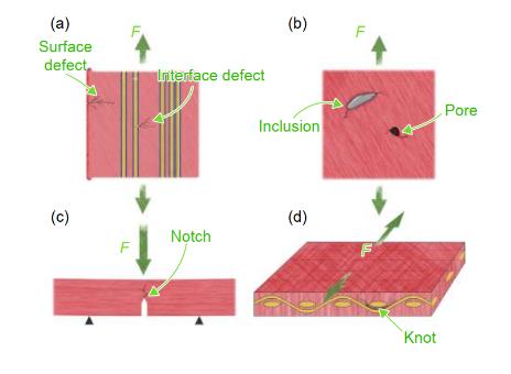 SiC/SiC 復(fù)合材料從損傷發(fā)生到最終破壞主要經(jīng)歷基體橫向開裂、層間開裂、纖維束與基體分離、纖維束內(nèi)基體開裂、纖維斷裂與拔出等損傷模式。裂紋萌生、擴展直至發(fā)生破壞的方式同纖維預(yù)制體結(jié)構(gòu)或鋪層方式、界面層的類型及其與纖維和基體的結(jié)合強度、基體缺陷等密切相關(guān)。表面和界面缺陷、內(nèi)容物和孔洞、人工狹縫或缺口尖端、編織結(jié)節(jié)等應(yīng)力集中部位容易成為裂紋萌生點,如圖 2 所示。由于缺陷的廣泛存在,基體裂紋往往在比例極限以下即可發(fā)生;但是在很低應(yīng)力水平下發(fā)生的基體裂紋并不一定直接影響材料的性能。